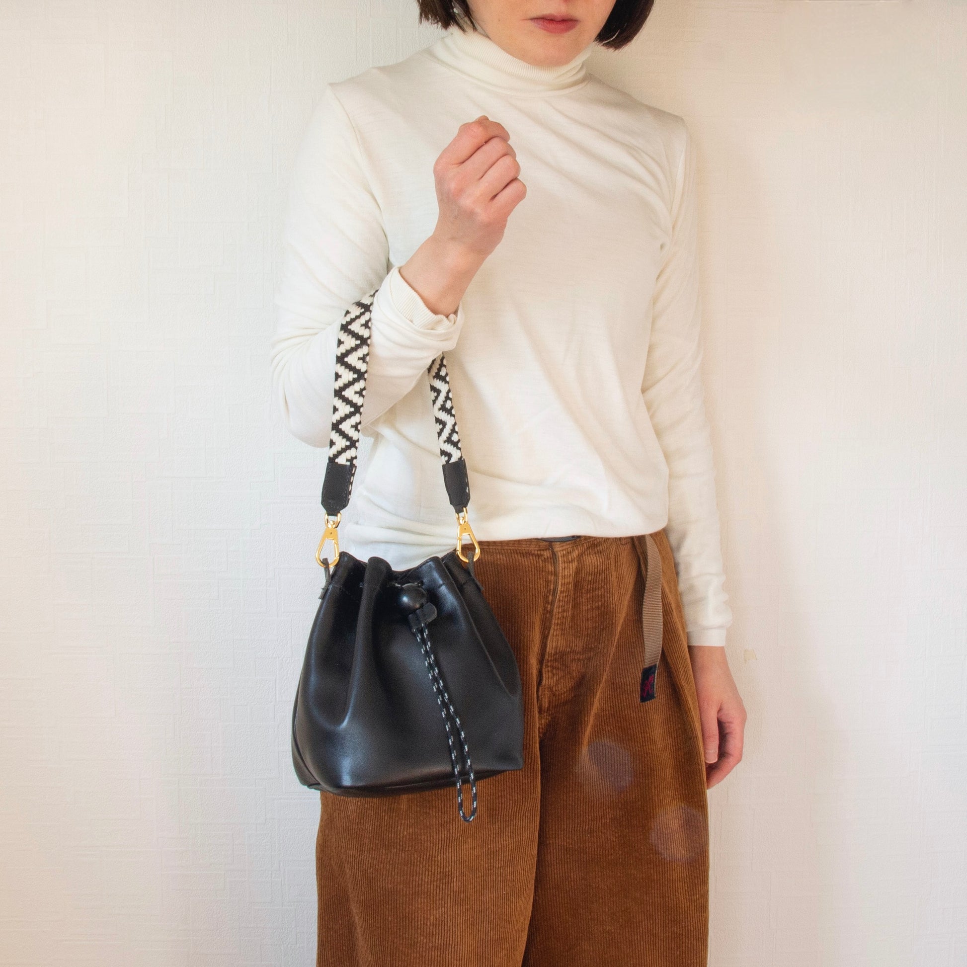 きちんとした雰囲気のトーンの時も、さりげないポイントに。のっぺりしたコーディネートにコロンとした巾着バッグが立体感をだしてくれます。
