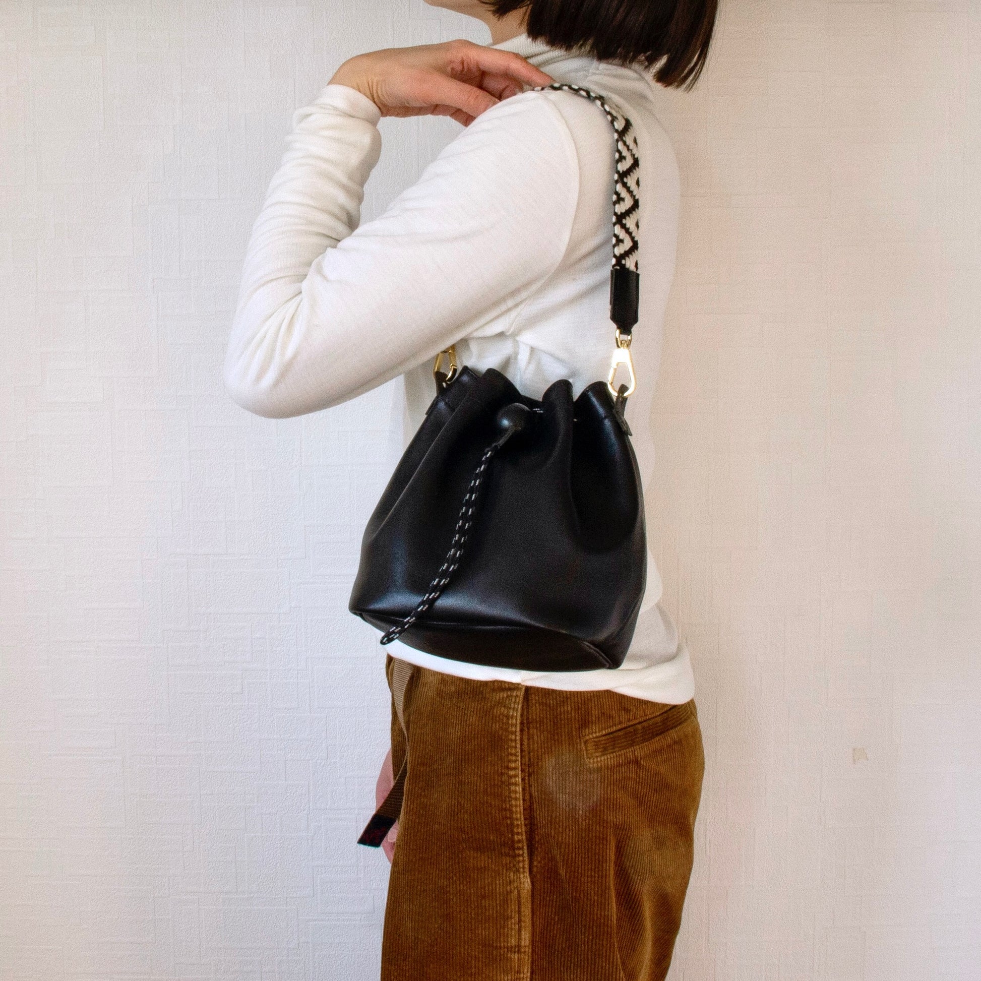 いつものスタイルにしっくり馴染む、レザーの巾着バック。