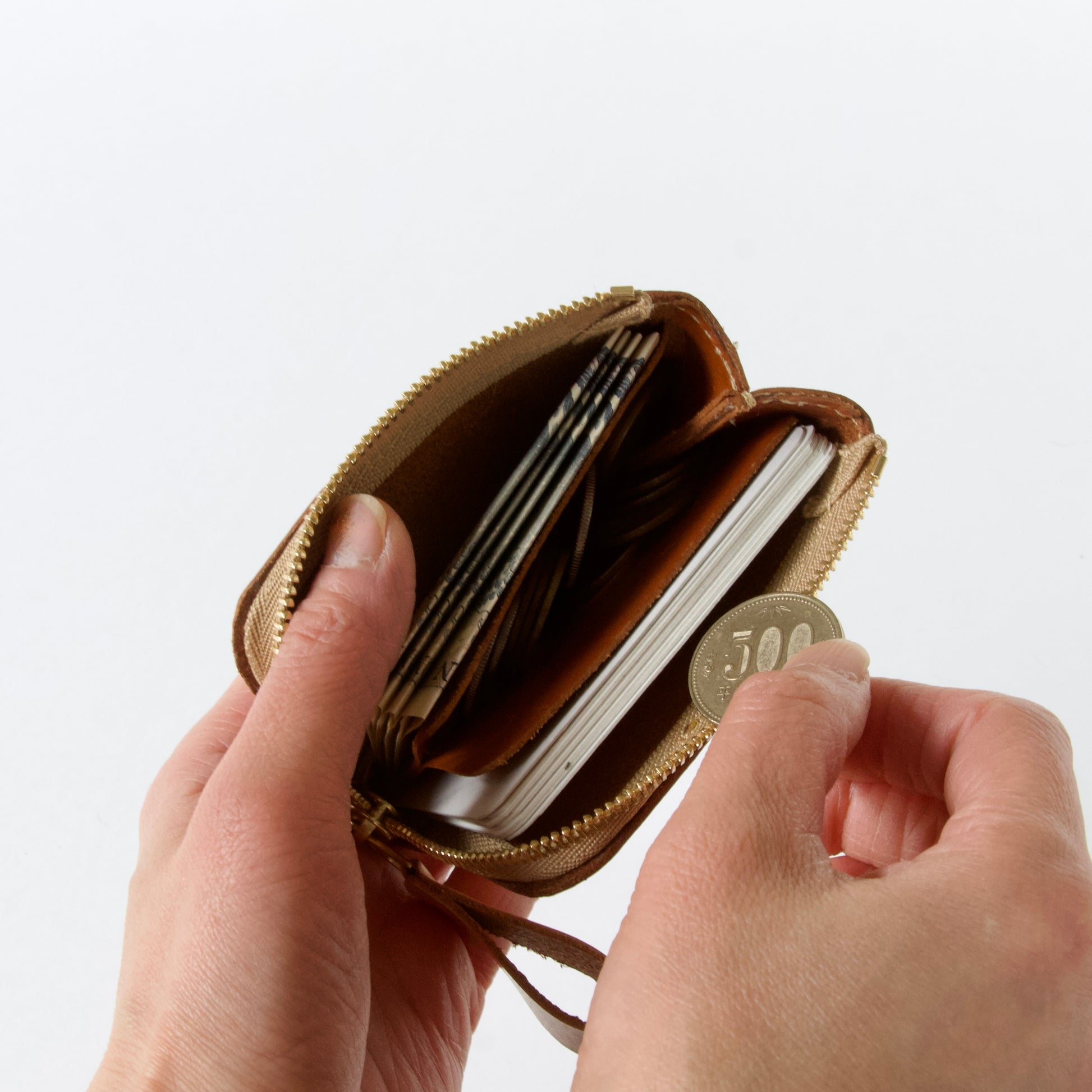 カードサイズでも脇マチがしっかりあることで、お札10枚、小銭13枚、カード5枚あっても溢れることはありません。