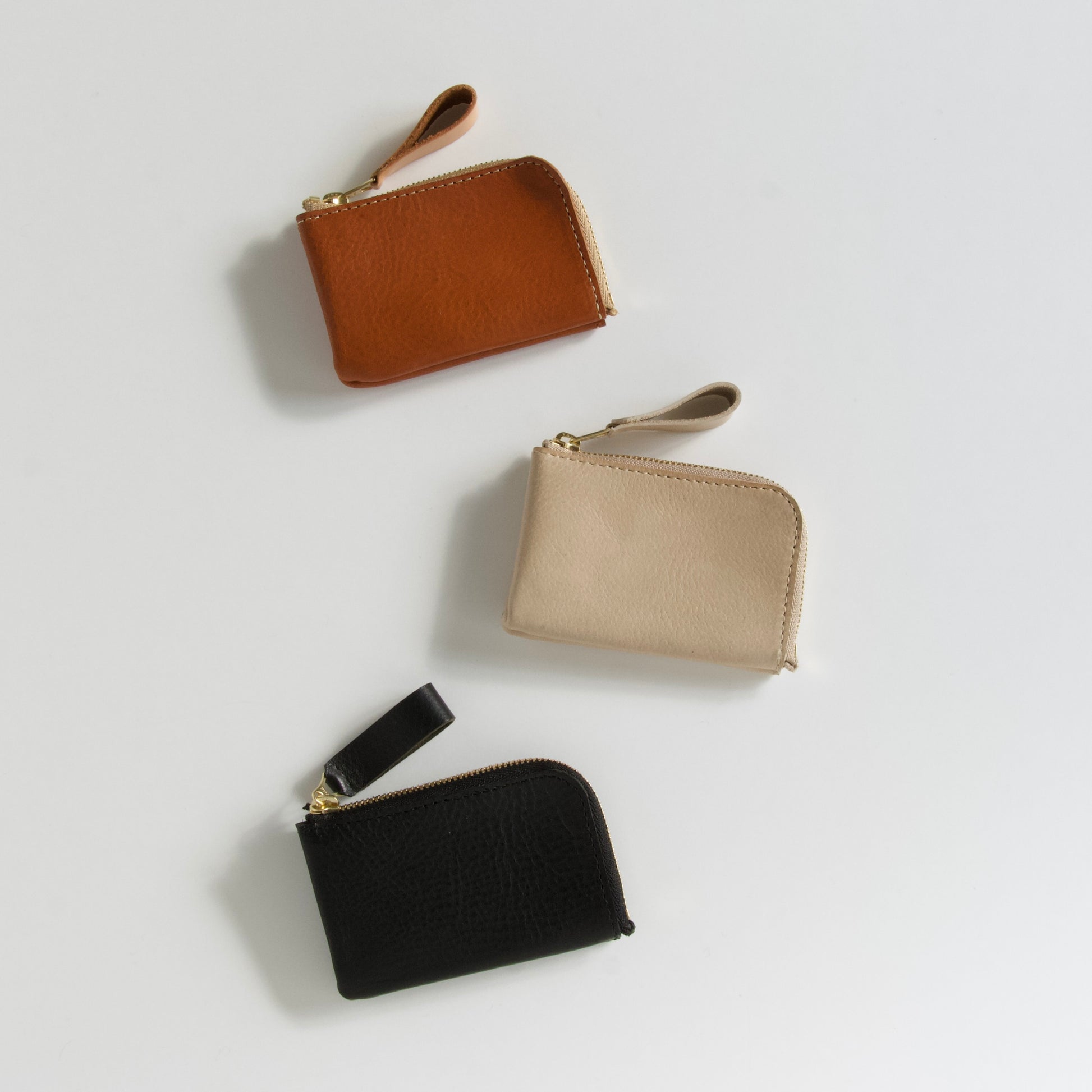 墨色に近いブラックと、使い込むほど色が濃くなり革らしい風合いが楽しめるキャメル。そして、人気のくすみライトベージュの3色。