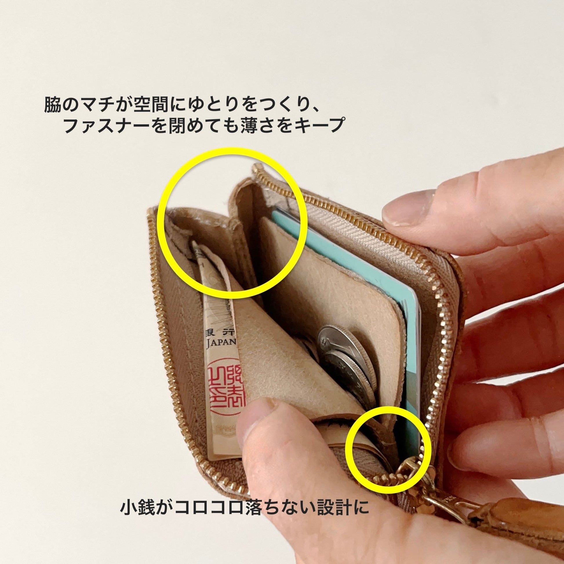 ファスナーを閉めても財布がパンパンにならず、薄さをキープできる効果があります。