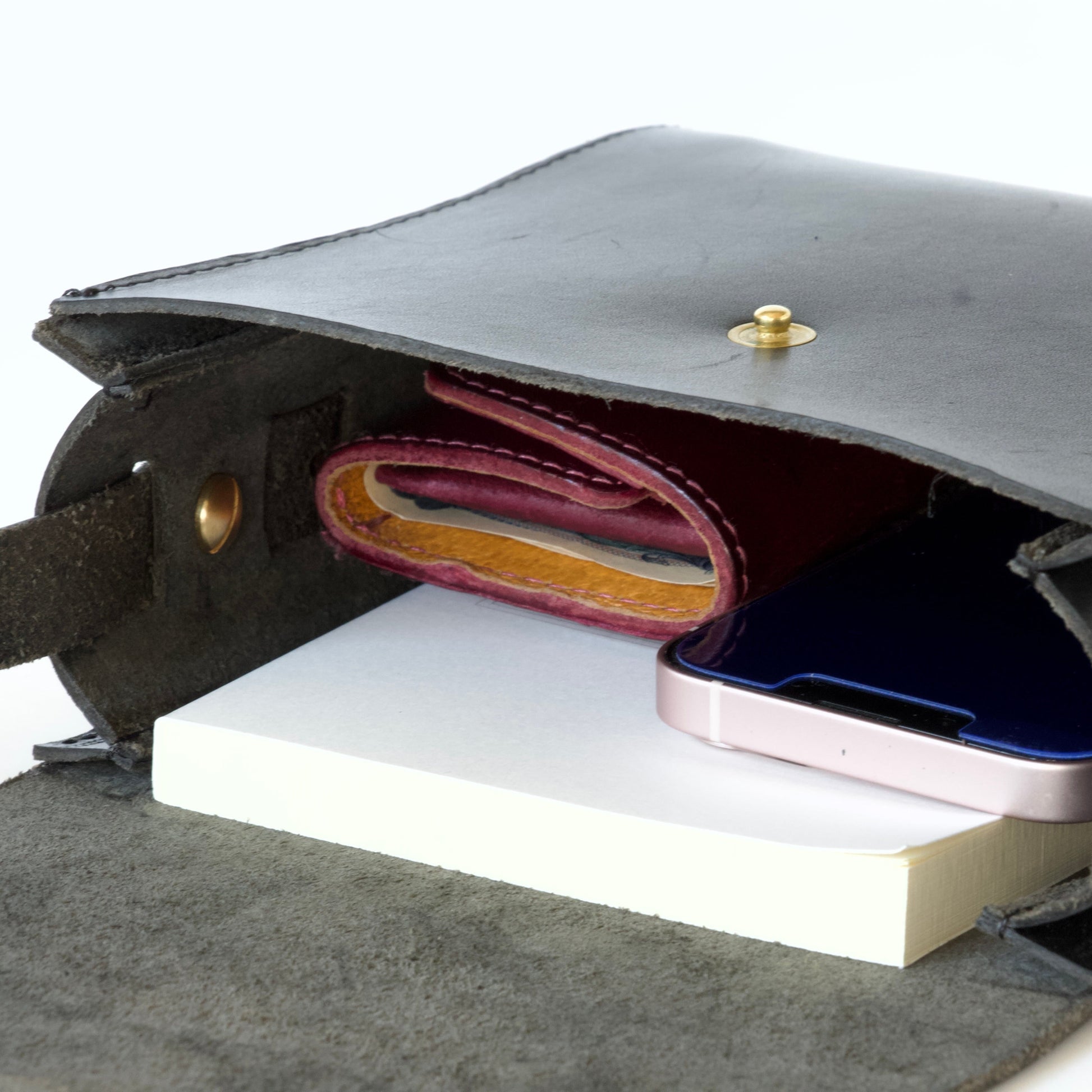 毎日使う、財布(ミディアムサイズまで)、スマートフォン、ハンカチ、ティッシュが、綺麗にきっちり収納。